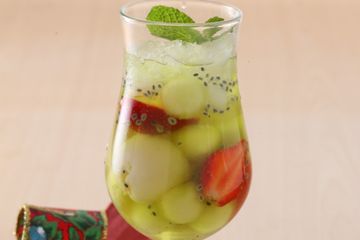 Masukkan dalam lemari es hidangkan selagi dingin ditambah es batu. Selanjutnya dalam wadah besar campur melon nata de coco kiwi parutan agar-agar sirup air dan es batu. 1 tetes pewarna hijau.